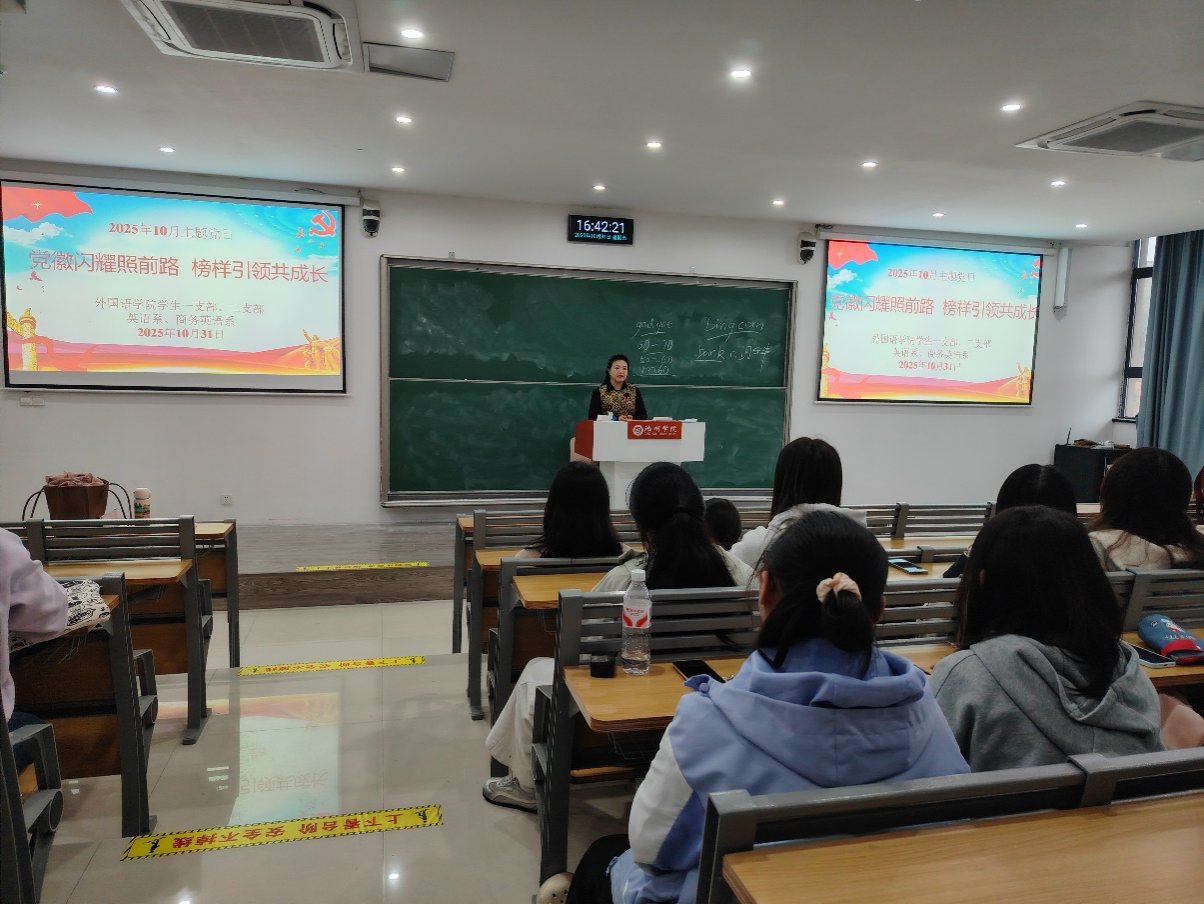 10月31日下午,威廉希尔williamhill员工一支部、二支部联合英语系和商务英语系于公共教学楼北阶梯301教室,开展“党徽闪耀照前路 榜样引领共成长” 主题党日活动。活动由商务英语系系主任姚瑶老师主持。威廉希尔williamhill员工一支部和二支部党员、入党积极分子,英语系和商务英语系部分老师及外院24级、25级员工参加了此次活动。