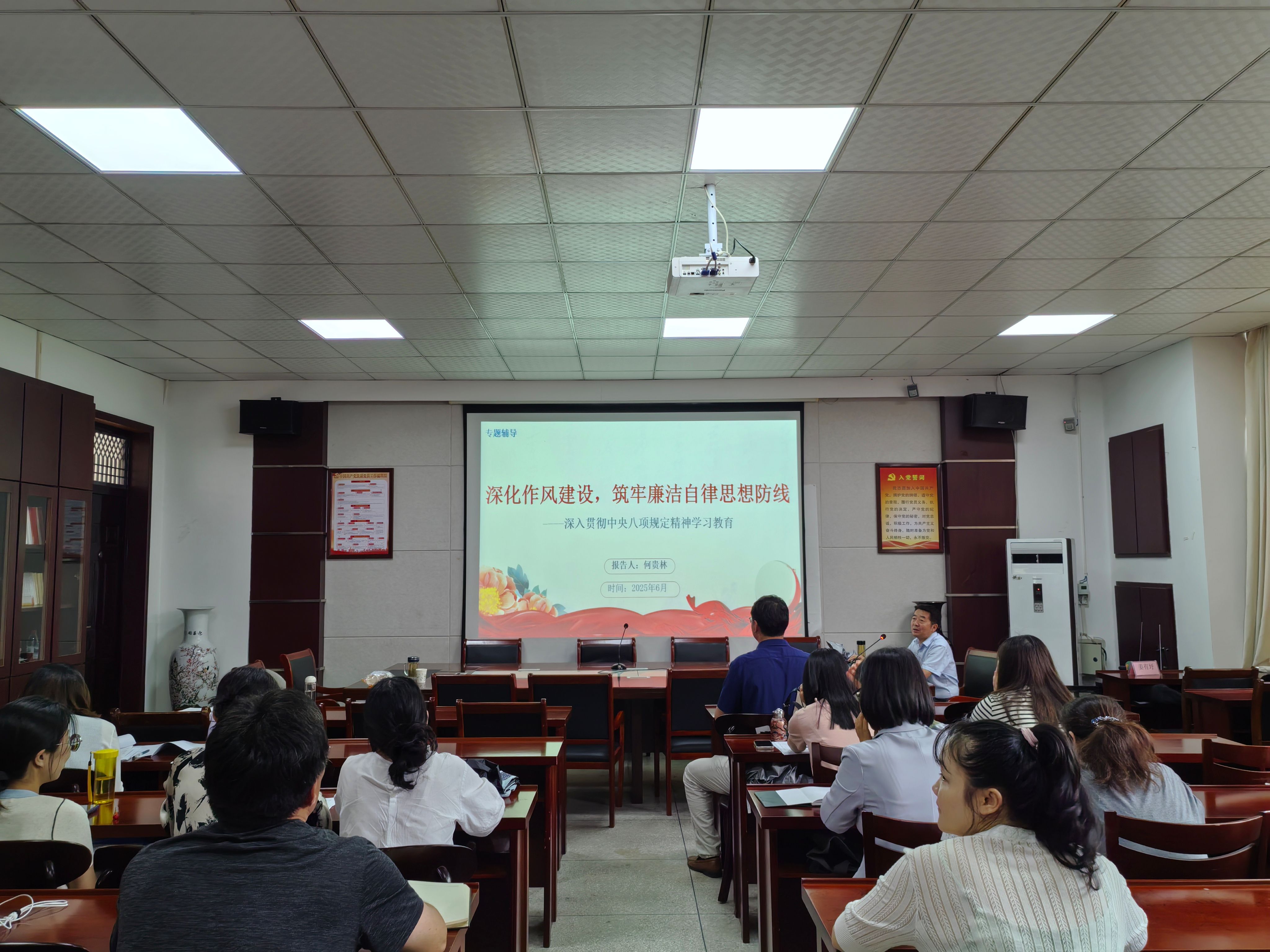 在党课过程中,何贵林还分享了一些加强作风建设的有效方法和经验。他建议党员教师要加强理论学习,深入学习党的纪律和规矩,不断提高自身的政治素养和纪律意识。