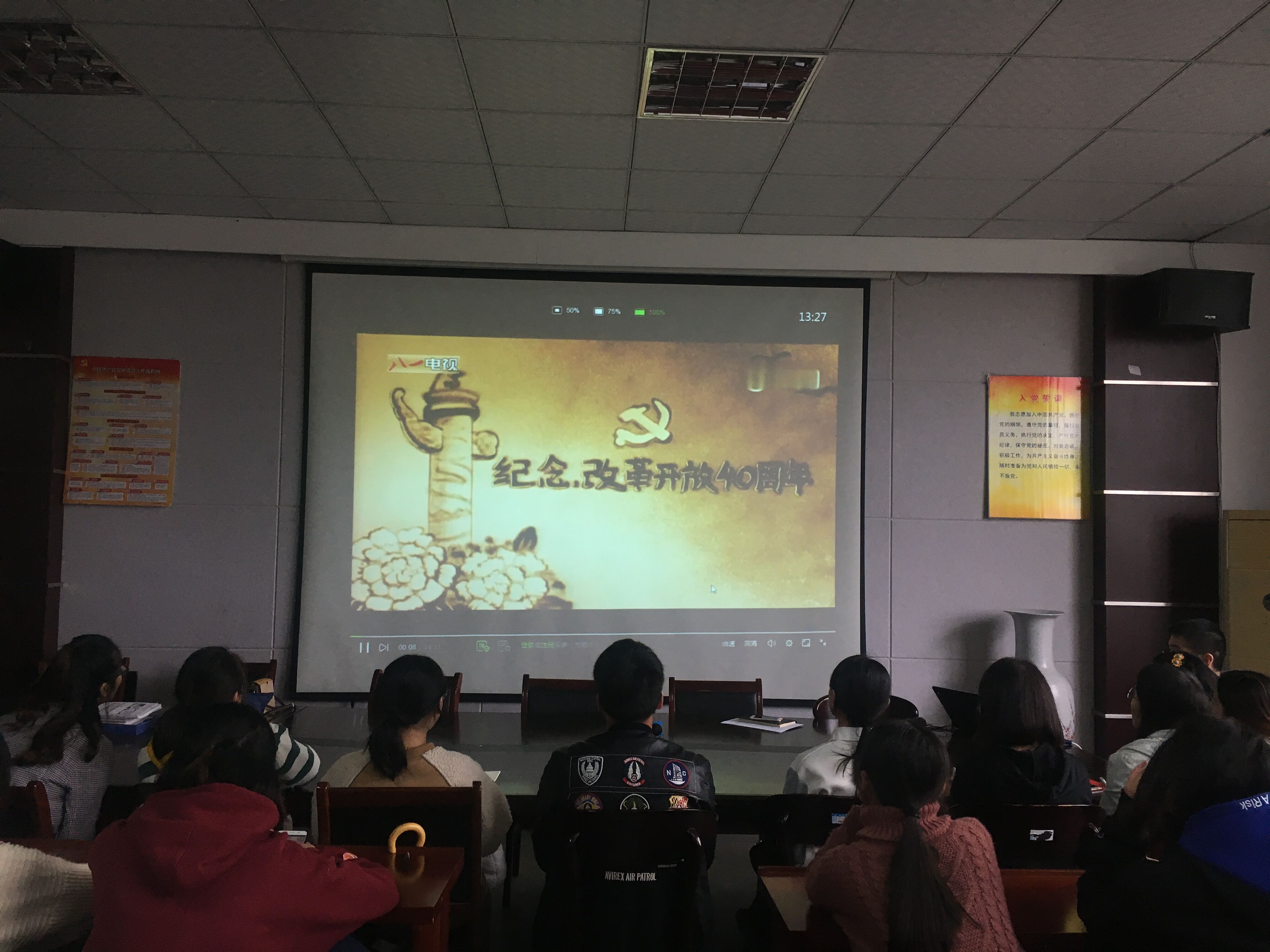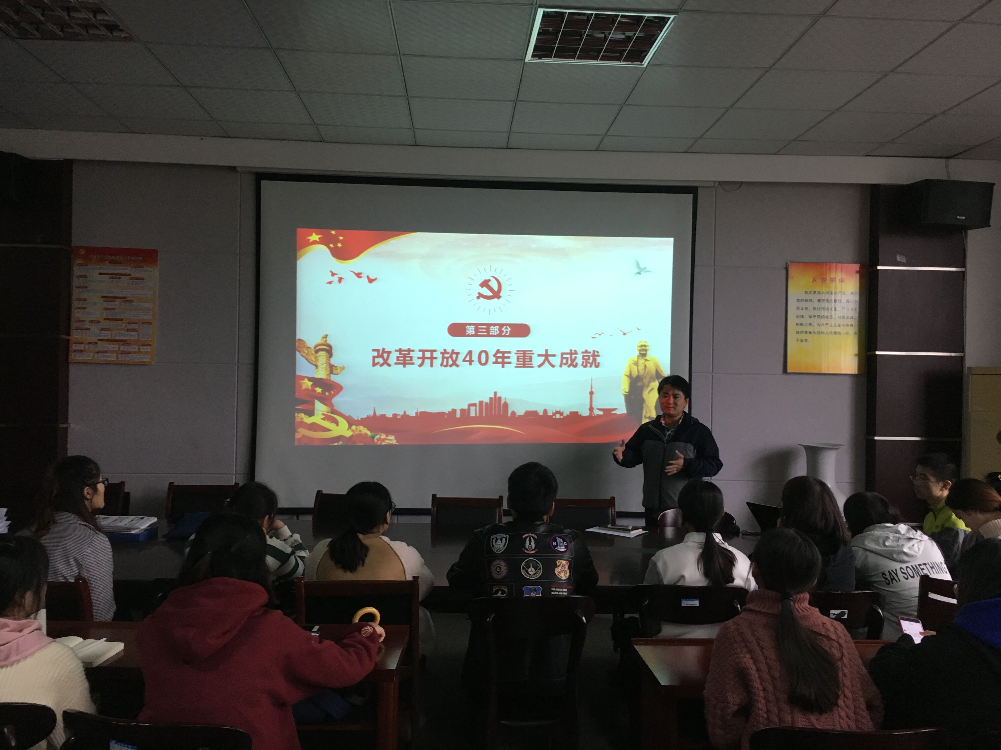 首先,刘军以“庆祝改革开放40周年”为题,给全体参会人员上了一节党课。党课从改革开放的背景、改革开放的历程 、改革开放40年重大成就 、中国40年改革的经验和新时代将改革进行到底等五个方面展开。让与会人员对中国40年来的改革开放有了全面深刻的了解。 随后大家共同观看了视频“纪念.改革开放40周年”。