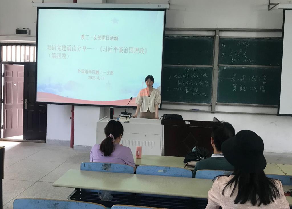 6月14日下午,威廉希尔williamhill教工一支部于博学阶101教室开展“双语党建诵读分享——《习近平谈治国理政》第四卷”主题党日活动,活动由支部书记鲁萍主持。支部全体党员参加了此次活动。