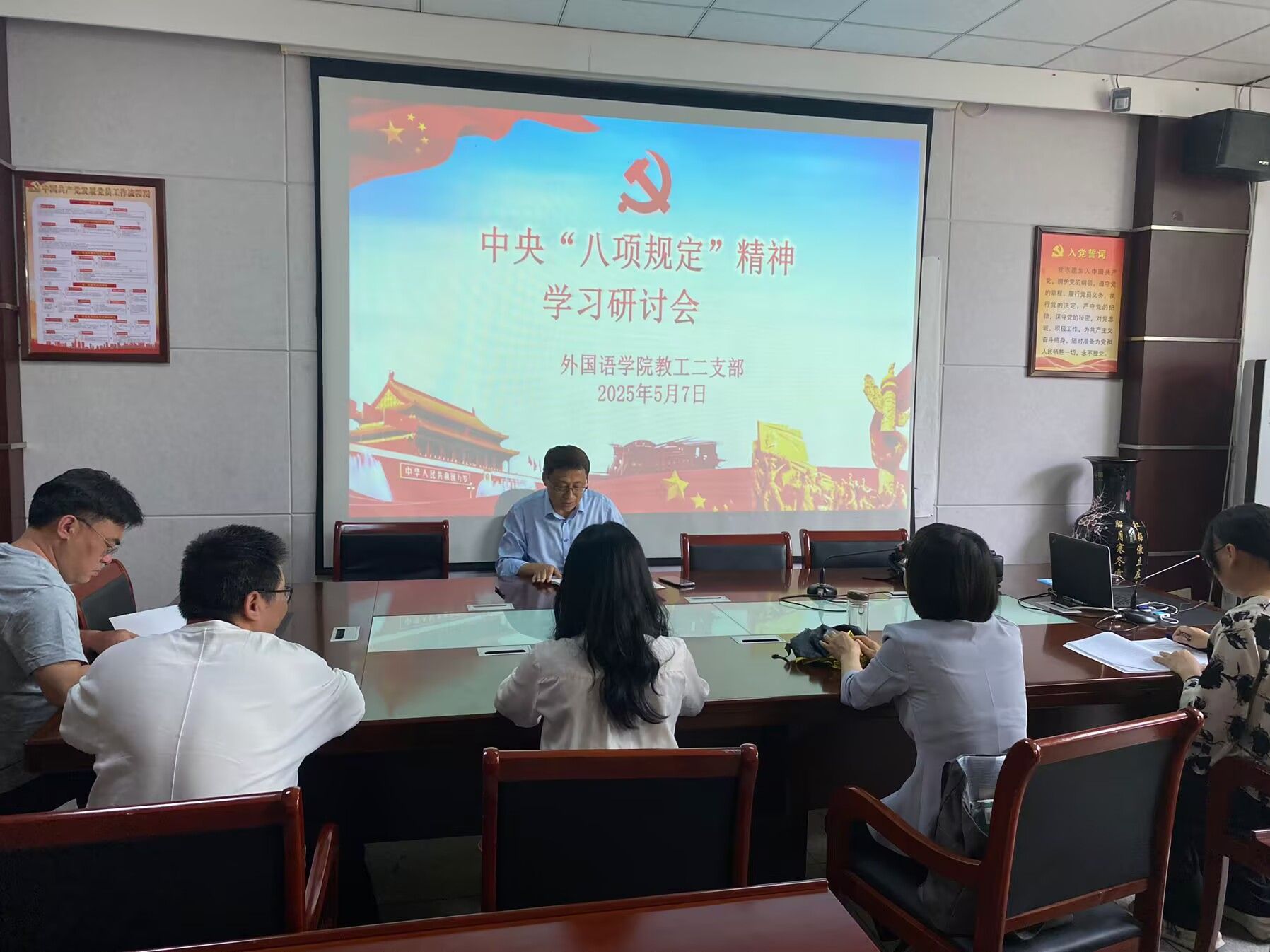 王志宏强调深化作风建设重要性。与会党员结合教学科研实际工作,踊跃分享学习体会和实践案例。会议达成共识:作风建设须融入日常教学科研全过程。在教学层面,党员教师要将八项规定精神有机融入课程思政,通过专业课程教学培养员工家国情怀、社会责任;科研方面,要重点推进“外语学科服务国家战略、地方建设”等课题研究;员工培养上,要深化“党员学业导师制”,建立思想引领长效机制。