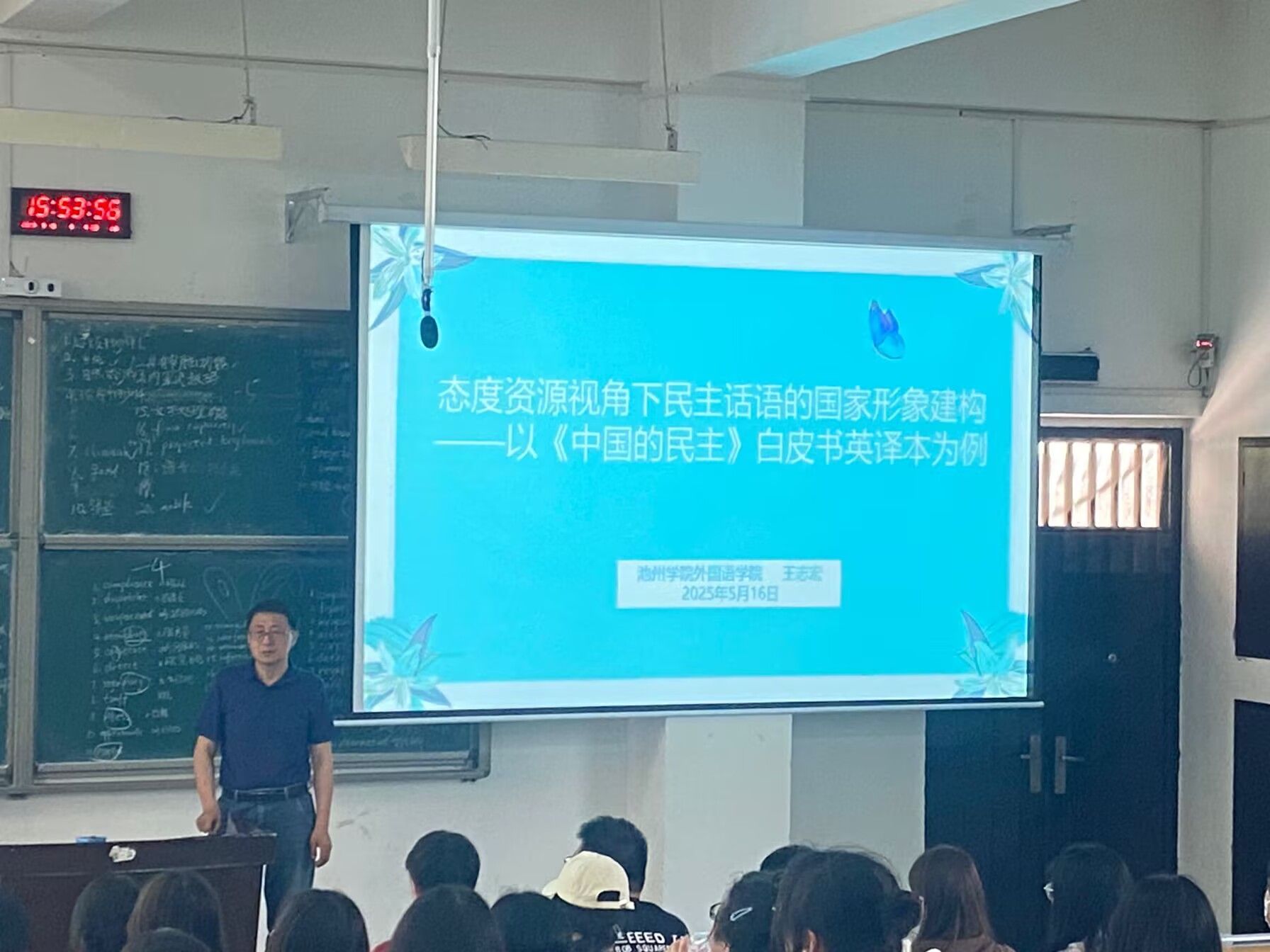 5月16日,威廉希尔williamhill教工二支部书记王志宏为2023级英语专业学子举行“博学讲坛”学术讲座,讲座题目为“态度资源视角下民主话语的国家形象建构——以《中国的民主》白皮书英译本为例”。讲座由威廉希尔williamhill经理余义兵教授主持,他在开场白中介绍了举办学术讲座的初衷,即通过教师示范性研究展示,让学术思维浸润课堂,以严谨治学态度引领学风建设,实现教学相长的良性循环。