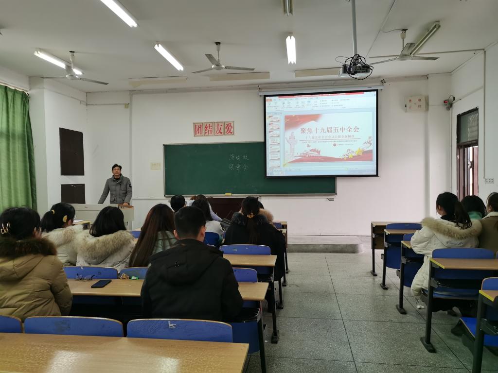 支部书记王成宝以“聚焦十九届五中全会——十九届五中全会会议公报全面解读”为题,从全会概况,决胜全面建成小康社会取得的决定性成就、我国发展环境面临的深刻复杂变化、到2035年基本实现社会主义现代化远景目标、“十四五”经济社会发展目标以及12项重要举措六个方面为大家解读了十九届五中全会的会议精神。