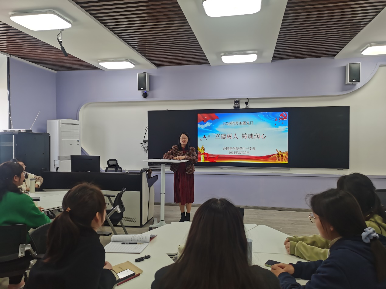 活动开始,2023年全国高校外语课程思政教学案例大赛特等奖获得者、基础英语教研室主任高扬老师以“用好外语教材,传播中国智慧”给支部党员上了一节党课。党课围绕全面理解“文明”和“和谐”的概念、强化社会主义核心价值观教育,领悟中国式现代化之生态文明建设理念、树立理论自信和文化自信,用英语讲好中国故事、强传播中国文化的能力这三个方面展开。