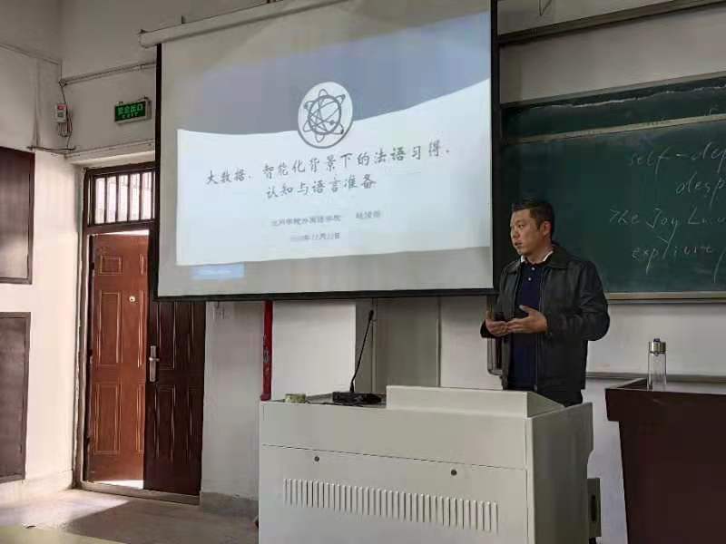 赵清曦老师以"大数据与智能化背景下的法语习得、认知和语言准备"为主题,为同学们讲解了大数据与智能化背景下,如何进行法语学习。他用幽默风趣的语言为2020级新生解答了对语言学习的困惑,也为他们在大数据时代背景下的语言习得提供了方向。赵清曦老师希望同学要珍惜大学美好学习时光,紧跟时代发展,学有所成。