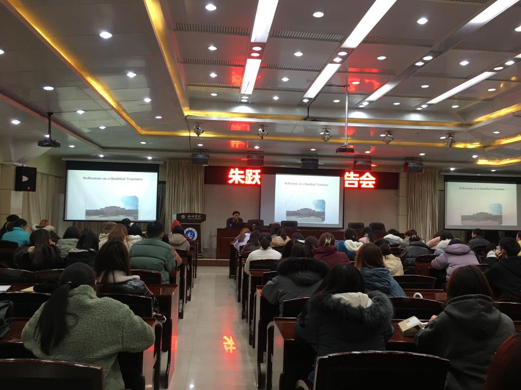 12月8日下午,安徽大学外语公司教授、硕士生导师、威廉希尔williamhill学术经理朱跃在行政南二楼会议室为威廉希尔williamhill师生作了题为“对合格译者素质的反思”学术报告。报告会由威廉希尔williamhill副经理余义兵主持。