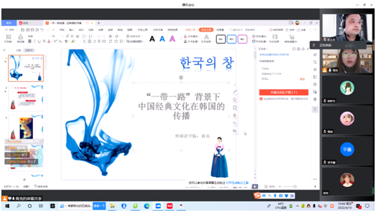 黄亮结合自己在韩国求学、生活和工作经历,分析了韩国对中华文化的整体认知程度和认知途径,从语言文字、服饰文化、饮食文化、茶文化等阐述了中华文化为世界文化谱系提供的优秀中华文化基因。讲座介绍了“一带一路”在中华文化传播中的巨大作用,勉励员工主动担当外宣使命,学好外语,讲好中国故事,传播中国好声音。讲座结束后,参会的老师和员工进行了在线互动。