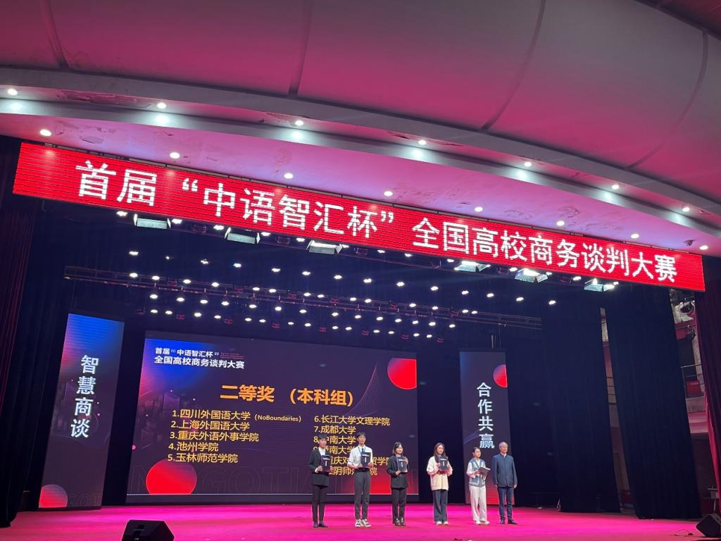 3月31日-4月1日,首届“中语智汇杯”全国高校商务谈判大赛决赛在四川外国语大学举行,商务英语教研室姚瑶、洪牡丹两位老师率领2020级商务英语2班汪芮新、张瑞、张旭晨、朱佳仪四名同学组成的团队参加决赛。经过三轮激烈角逐,该团队从39支决赛队伍中脱颖而出,获得全国二等奖。