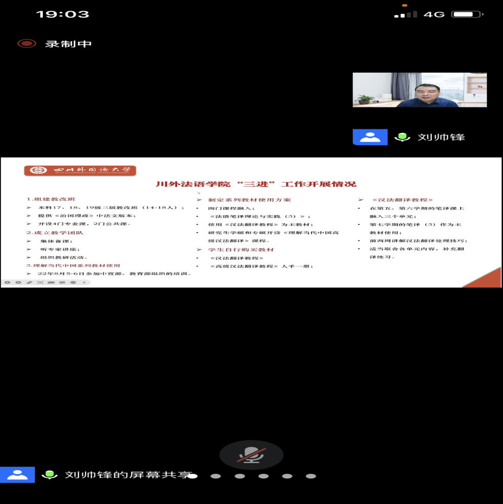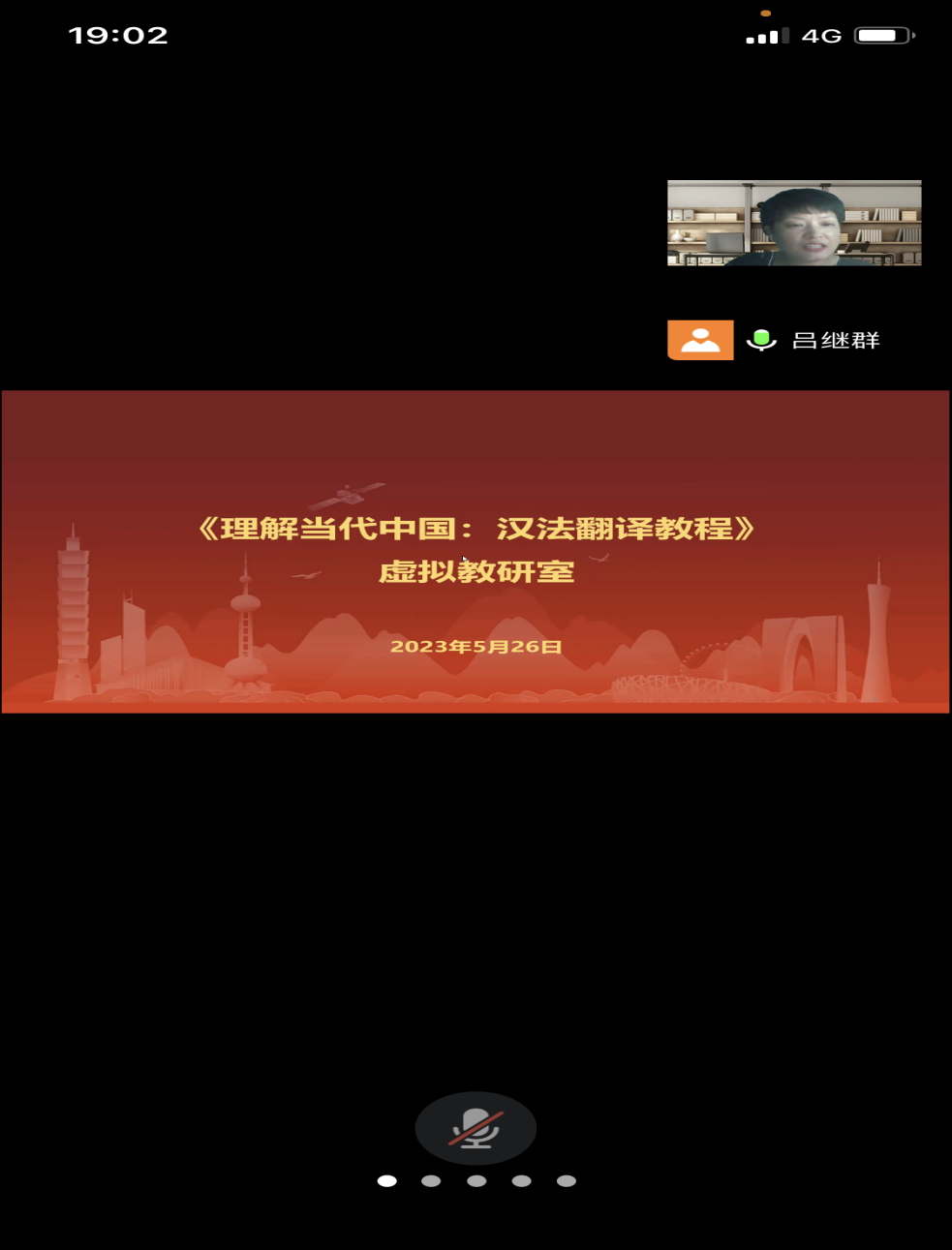 为深入推进“三进”工作,构建外语人才培养的新格局,5月26日,小语种教研室全体教师齐聚云端,参加由外研社“理解当代中国”系列教材之《汉法翻译教程》编委会组织的虚拟教研室活动。