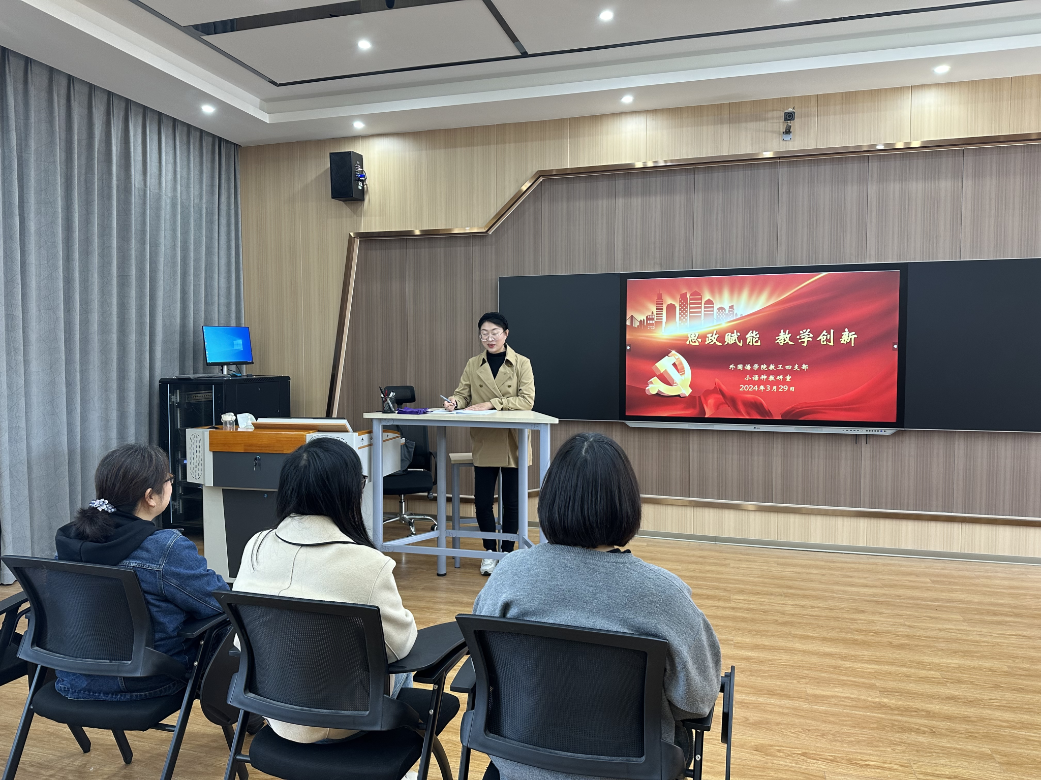 为通过课程思政教研项目申报增强教师课程思政教学能力,钱培培老师就小语种课程思政教学研究项目的申报与建设进行了分享,涉及选题方向、项目框架设计、教学内容与方法创新等方面。支部党员与小语种教研室教师积极发言研讨。