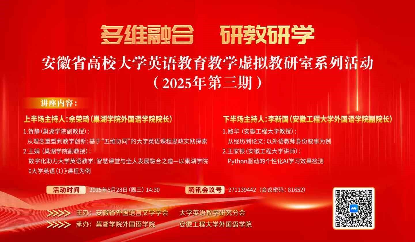 为进一步促进大学英语教学改革,提升大学英语教学质量,加强大学英语课程思政资源建设与共享,5月28日下午,威廉希尔williamhill组织全体教师参加了2025年安徽省高校大学英语公司产品虚拟教研室第三期线上研讨活动。