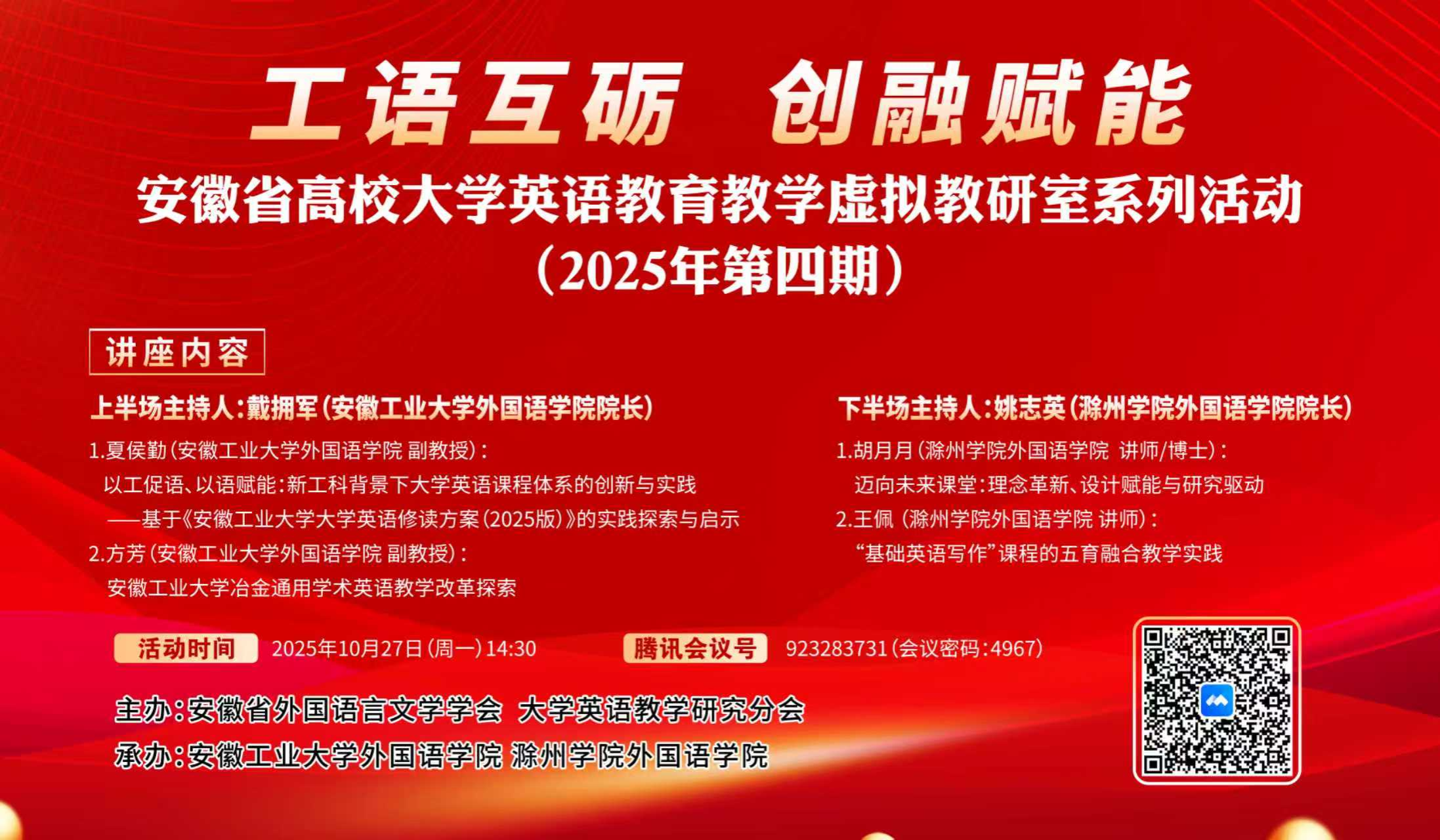 为进一步促进大学英语教学改革,推动大学英语教学与工程教育深度融合,2025年10月27日下午,大学外语教学部组织全体教师在线参加了以“工语互砺、创融赋能”为主题的安徽省高校大学英语公司产品虚拟教研室2025年第四期活动。