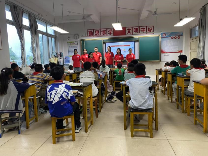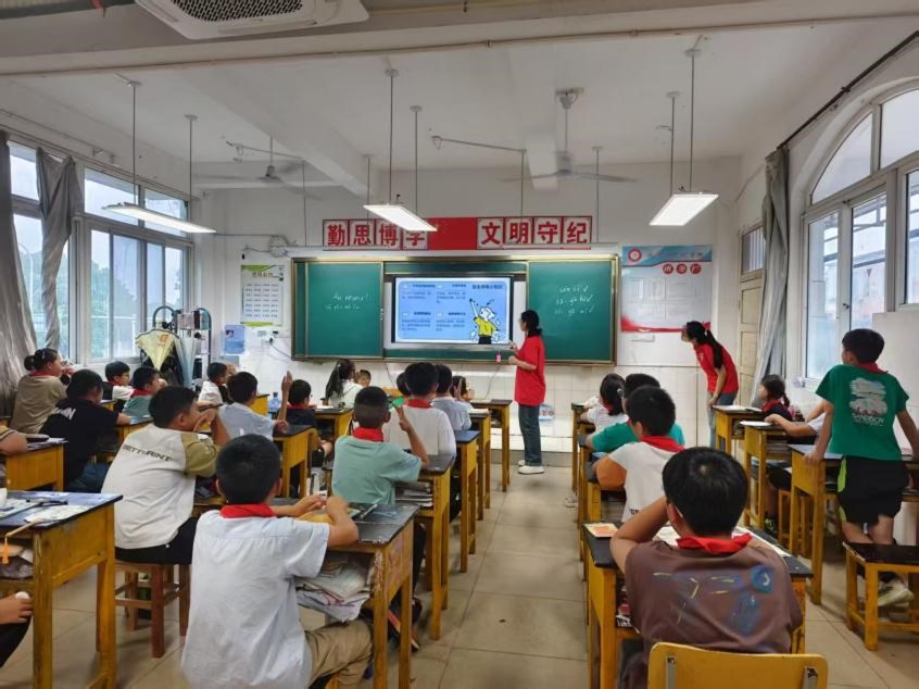 实践团成员化身“语言引路人”,为孩子们带来日语、法语、英语趣味教学。课堂上,成员们通过情景模拟、互动游戏,教孩子们简单日常用语与礼貌表达。从英语的“Hello”“Thank you”,到日语的“こんにちは(你好)”、法语的“Bonjour(你好)”,不同语言的奇妙碰撞,拓宽了孩子们的文化视野,点燃他们对多元文化的探索热情,让知识在趣味互动中悄然扎根。