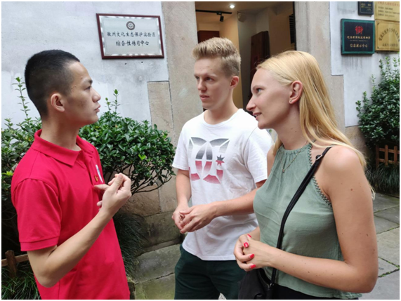 10日上午,成员们拜访了中国国际旅行社欧美部总监王总监。王总监是一名从业三十多年的资深旅游人,师范院校英语专业毕业的他也曾是一名英语老师,与英语有着不解之缘。在接近一个小时的交流中,成员们对英语导游行业有了更加深入的了解,也体会到老一辈旅游人对这份职业的自豪感。几经辗转,成员们于下午三点又来到携程旅行黄山分部。在这里,成员们了解到目前黄山市游客自行线上定制出入境旅行呈逐年增长趋势,2019年1月份至今已接待1600多人次欧美团游客,带团导游平均每天的补助为600元,比线下旅行社高出200元。随后,成员们来到常有外国游客旅游观光的屯溪老街,采访了1名英语导游和7名来自美国、英国等不同国家的外国游客。通过访谈,成员们了解到:外国游客愿意支付给业务能力优秀的英语导游每天500元至1000元不等的报。可以看出,英语水平高的导游就业前景良好。