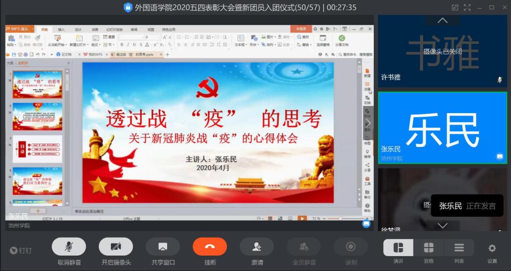 会后还开展了“绽放战疫青春·坚定制度自信”主题宣传教育实践活动。张乐民以“通过战‘役’的思考”为题为参会团员上了一堂主题团课。