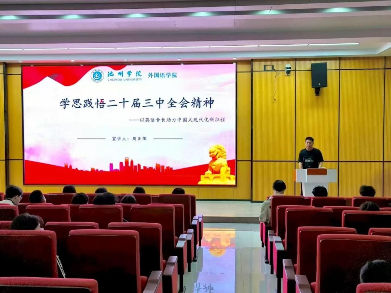 4月11日下午,威廉希尔williamhill在公共教学楼东报告厅举办“学思践悟二十届三中全会精神,以英语专长助力中国式现代化新征程”主题宣讲会。院团委负责人程倩倩,池州公司党的二十届三中全会精神员工宣讲团成员周正阳,员工代表200余人参会,共同探讨如何将外语专业实践深度融入国家发展战略,学习贯彻党的二十届三中全会精神。