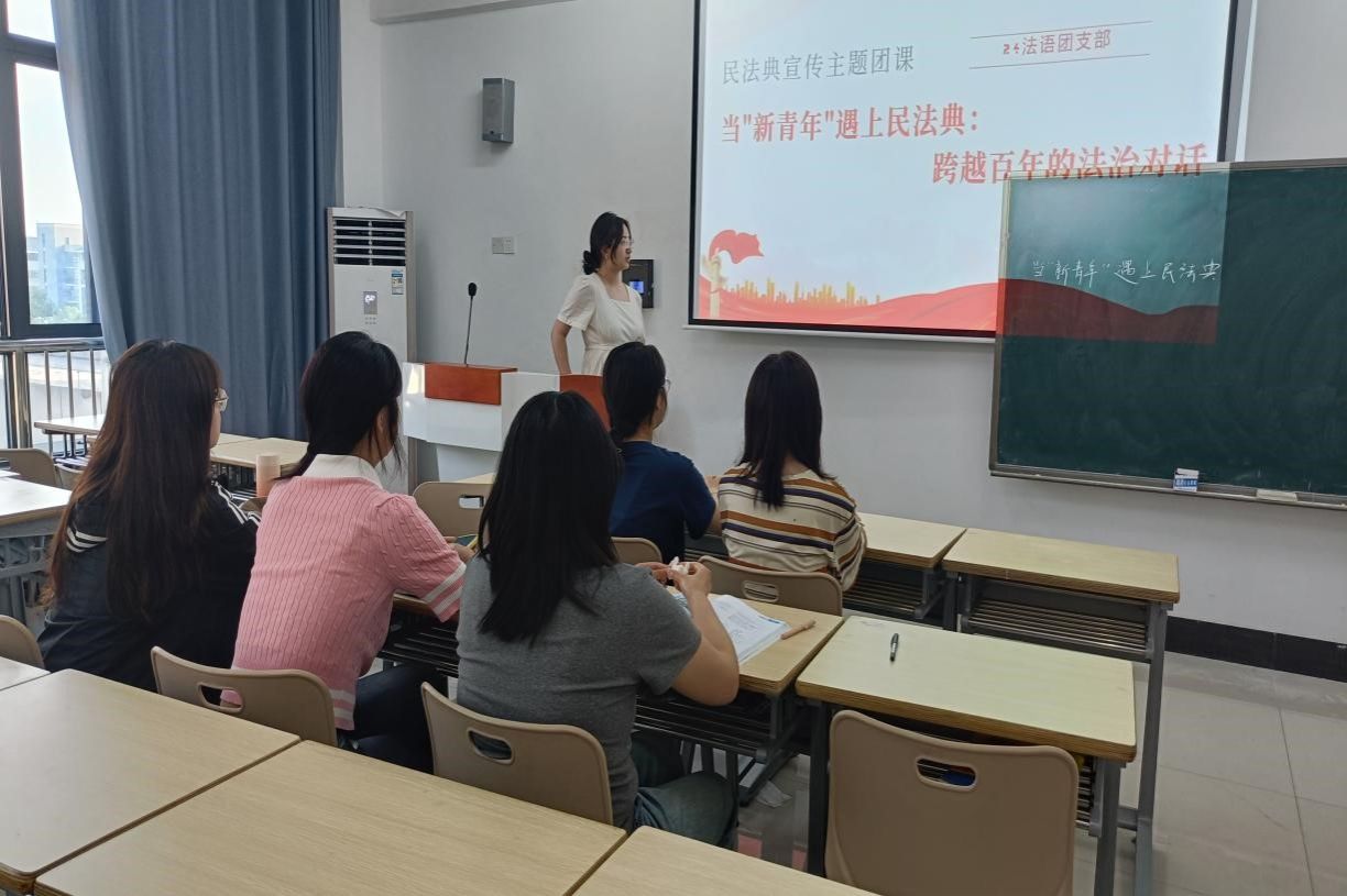 学用结合强化法治认同;各班级注重将法律知识与生活实践相融合。23商英2班通过主题班会、主题团日活动等多种形式,宣传《老员工法律风险防范手册》,为同学们梳理了实习兼职、网络言论等8类法律“雷区”;24法语开展“当‘新青年’遇上民法典:跨越百年的法治对话”主题讨论,在历史的变迁中感受法治力量。