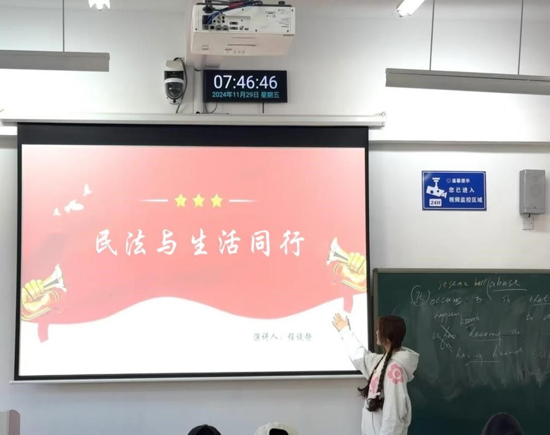 多元形式激发学法热情;各团支部结合专业特色,打造“一支部一品牌”普法课堂。24英语1班以“案例解读+知识竞赛”为主线,通过团支书情景化讲解网购维权、隐私保护等热点问题,配合“一站到底”擂台赛深化学习实效。