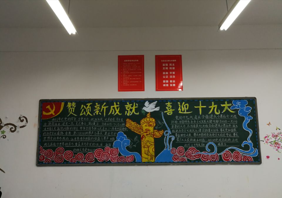 为加强校园精神文明建设,营造良好的校园文化氛围,迎接即将召开的党的十九大的胜利召开,公司党总支于10月16日下午举行优秀主题黑板报评比活动。各班均积极响应公司号召,有的班级板报是员工和辅导员老师共同完成,有的班级板报是员工独立设计并完成,都做到了主题突出,政治意义鲜明、图文设计美观、新颖,形式多样,内容丰富。经评选,17级商务英语3班主题为“赞颂新成就,喜迎十九大”的黑板报获得一等奖。