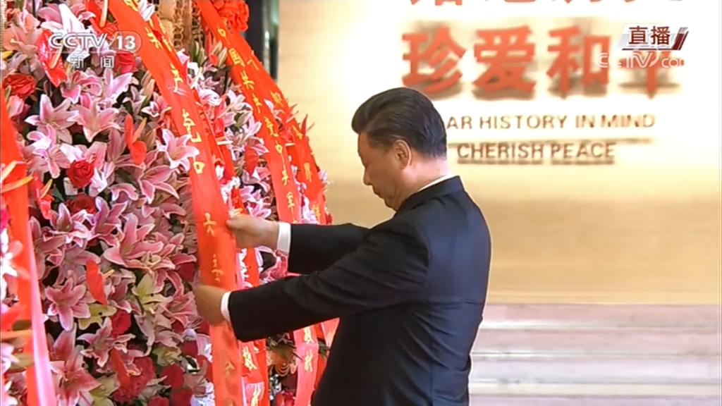上午10时,在中国人民抗日战争纪念馆,习近平等党和国家领导人同首都各界代表一起向抗战烈士敬献花篮。节目中,主持人和现场嘉宾共同回顾了中国人民14年的艰苦卓绝的抗战历史,深切感受“天下兴亡、匹夫有责的爱国情怀,视死如归、宁死不屈的民族气节,不畏强暴、血战到底的英雄气概,百折不挠、坚忍不拔的必胜信念”的抗战精神。