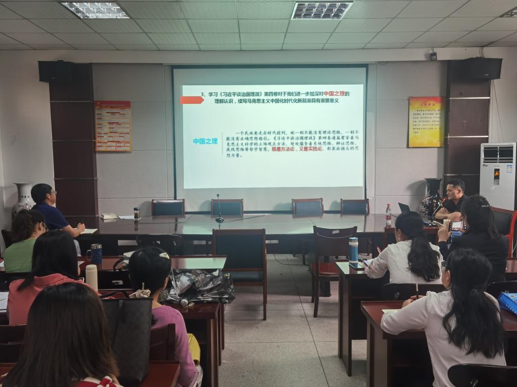 池州市市委宣讲团成员、马克思主义公司教授俞念胜作专题辅导报告。俞念胜以“深刻认识‘两个确立’决定性意义的权威著作”为题,介绍《习近平谈治国理政》第四卷的框架结构,阐述学习第四卷的重要意义,希望全体教师认真学习领会,发扬历史主动精神,结合《全面推进“大思政课”建设的工作方案》,把学习成果融入到教学科研中去,转化为推动公司高质量发展的具体举措。吴丽莹、徐津津、闻雯三位老师围绕《习近平谈治国理政》多语种版本进高校、进教材、进课堂作了交流发言。