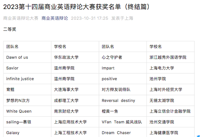 10月27日-28日,第十四届“高教社杯”商业英语辩论大赛决赛在上海应用技术大学徐汇校区和上海生命科学研究院举行,威廉希尔williamhill陈倩、姚瑶两位老师指导的2021级商务英语2班朱冰洁、方若珩、叶丽兰三位同学从复赛66支队伍中脱颖而出进入决赛,荣获全国二等奖。