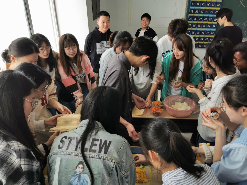 活动前,老师和同学们准备好制作泡菜饼和紫菜包饭所需的工具和原材料。现场老师为同学们讲解制作方法、步骤,并示范制作过程。随后,在老师的指导下,同学们都亲自参与了泡菜饼和紫菜包饭的制作。此次活动共有40多位师生参加,现场氛围非常热闹。
