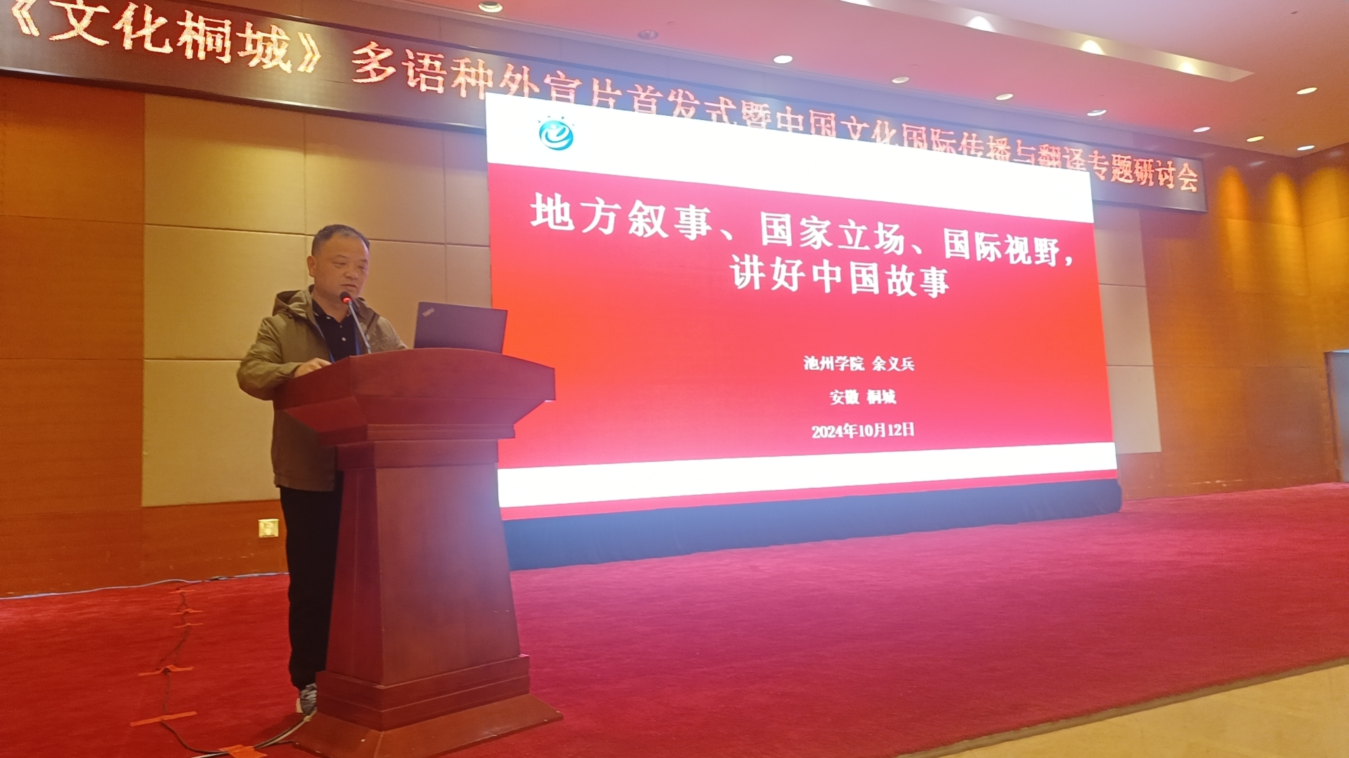 10月12日,《文化桐城》多语种外宣片首发式暨中国文化国际传播与翻译研讨会在桐城举行。池州文化外译与传播研究中心主任余义兵应邀参加会议,并作题为《地方叙事、国家立场、国际视野,讲好中国故事》的学术报告。